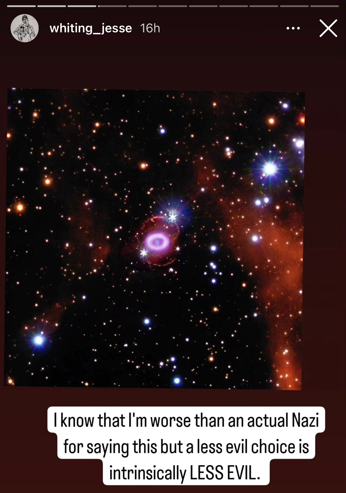 No one wants to make a decision that feels gross. Uncomfortable. But if I remove my emotions and anxieties and anger from it, if I do the math, there’s an answer. An answer where less people die. Less people hurt. And not just in Palestine. Across the world—and here, in the U.S. It’s abhorrent that our country or its enabled allies would kill anyone in the first place—that we could vote for anyone who would be okay with allowing that. But short of the U.S. party and electoral system miraculously untangling itself into a 100% fair system unlike the world has ever known before November—if we want a world with less pain in it, we don’t have any other option but to face the uncomfortable.
