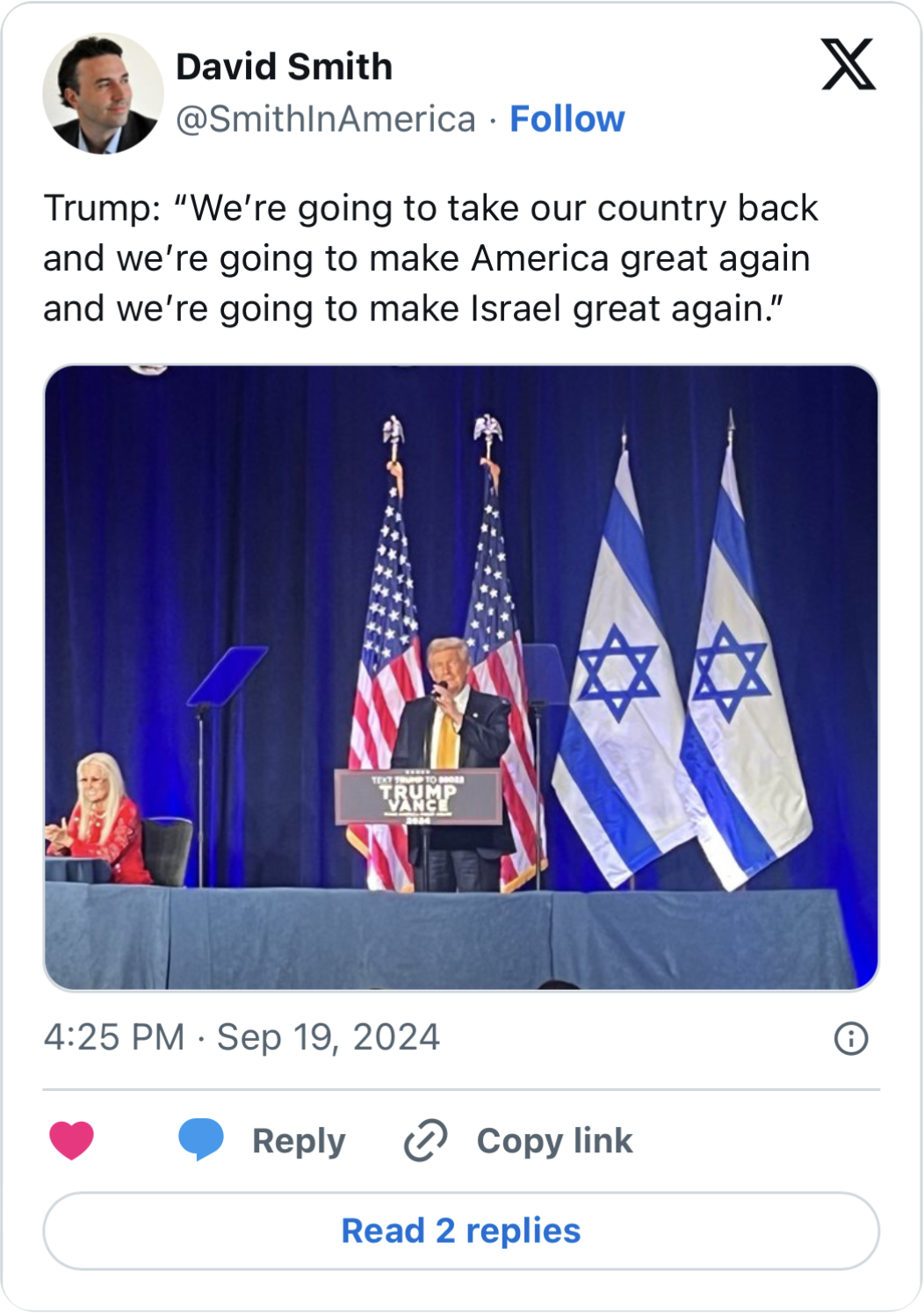 It's not just because they're basically the same guy. Netanyahu is still holding meetings with Trump. There are reports of calls between them which may be interfering with the situation in Gaza. Trump supports a one-state solution. There is a “settlement” named after him in the West Bank (and some of Trump’s megadonors want the whole West Bank annexed, of course). If Trump wins, Netanyahu gets to do whatever he wants; he gets even MORE weapons. If Harris wins, he'll have to deal with her concerns, with traditional backstops, with image-consciousness—at the very least.