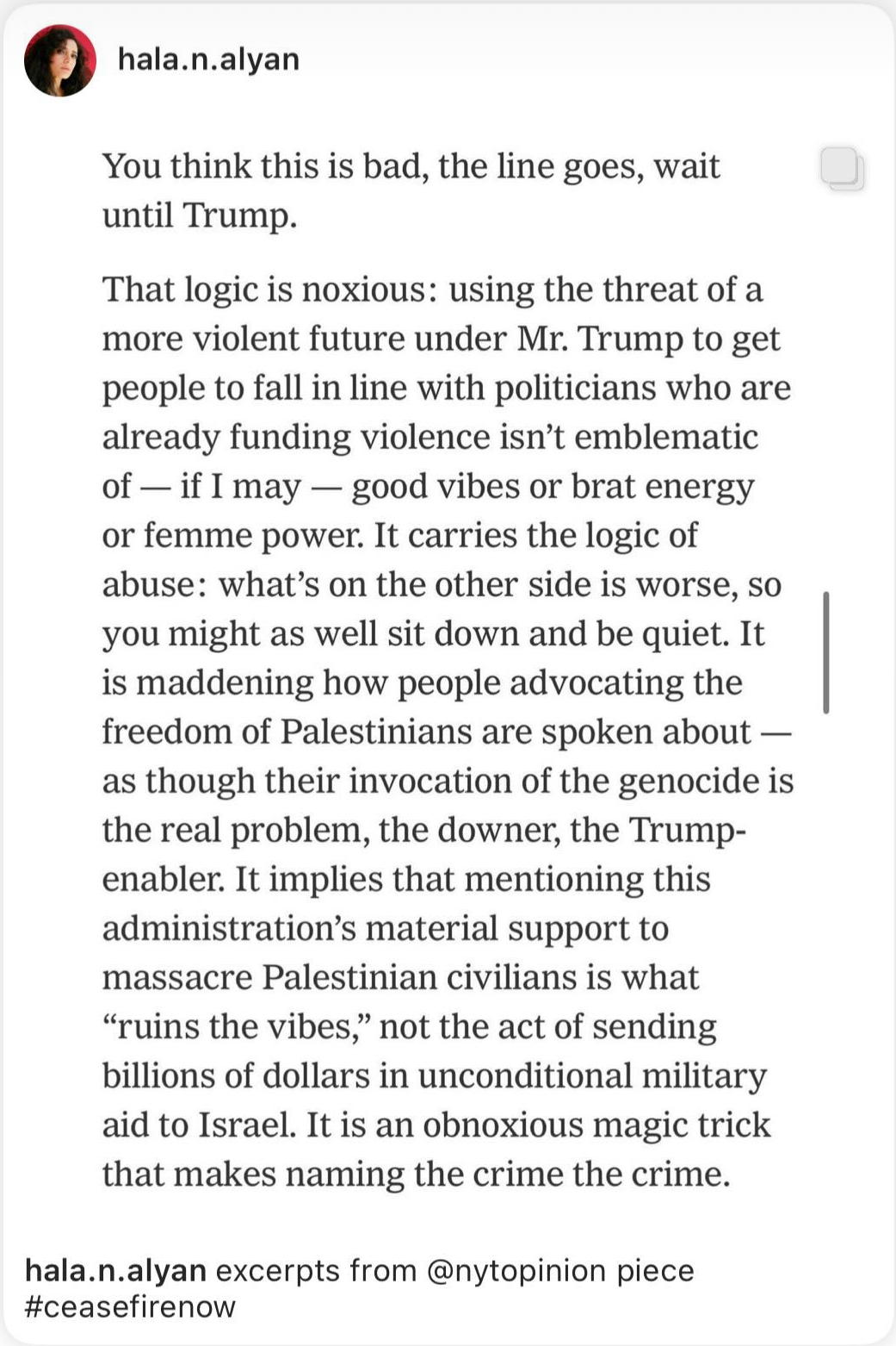 My ballot is on the way. And y’all—I’ve been struggling with something: Harris is our best option. She's also our best option for Palestine.
